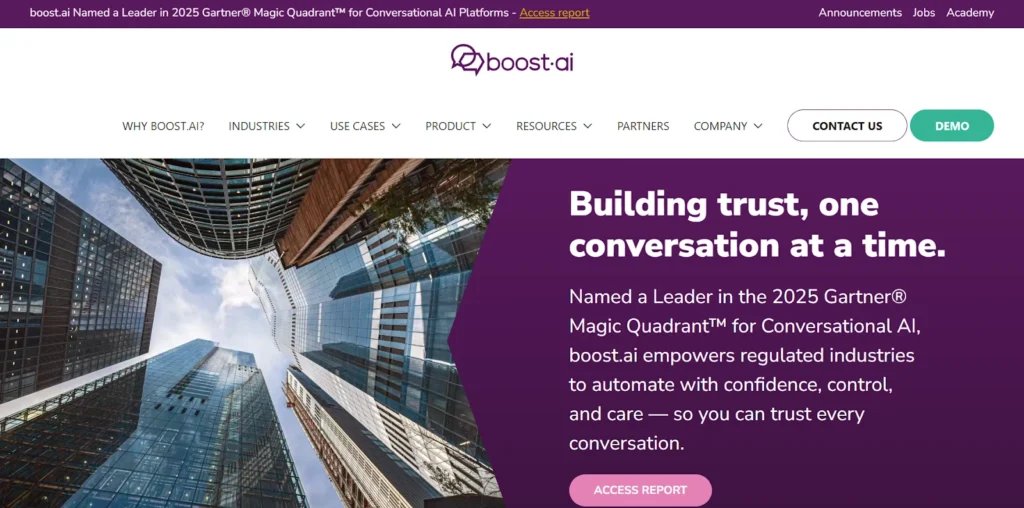 Pricing: Boost.ai uses contact-sales/custom enterprise pricing. Their public presence—both vendor site and directory listings—does not disclose fixed plans, indicating tailored quotes.