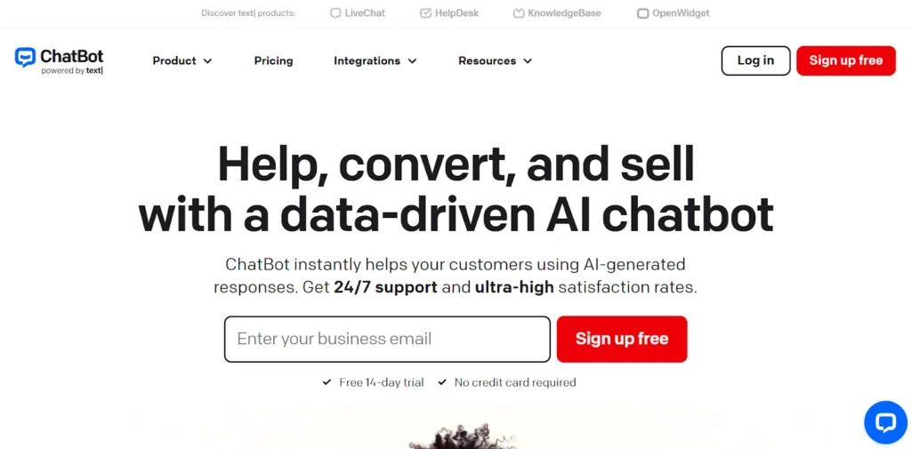 Pricing: ChatBot offers a 14-day free trial (no credit card required). Its Starter plan is $52/month, which gives you 1 active chatbot and 12,000 chats/year.