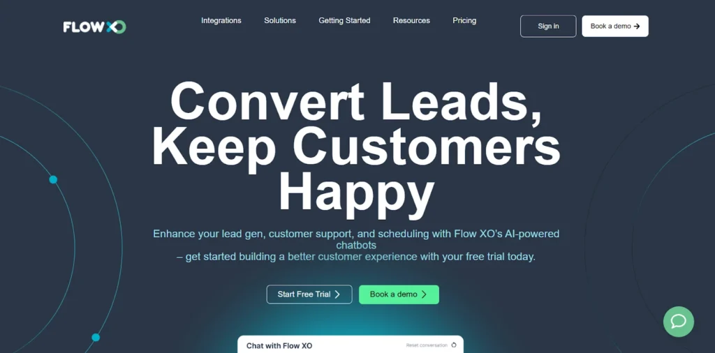 Flow XO is focused on flexibility and integration, offering a balance between workflow automation and chat capability. It supports website chat widget, Messenger bots, rich UI elements, segmentation, broadcasting (basic), and human handover. Its editor uses triggers, flows, and actions, giving you modular control over conversational logic, and you can call APIs or webhooks for dynamic behavior.