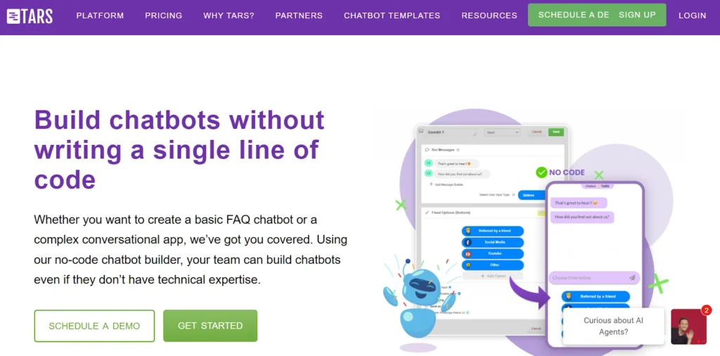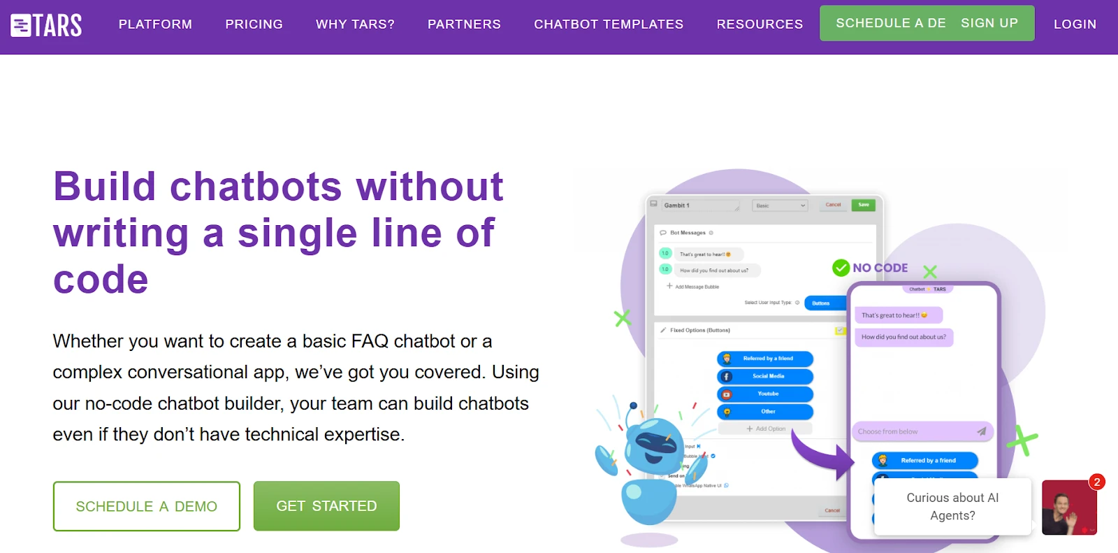TARS specializes in creating conversational landing pages and replacing static forms with chat-based flows. It supports website chat, Messenger, a node-based visual flow builder, a template library (industry/channel specific), and handover to humans. Because its design is focused on conversion funnels, TARS excels at guiding visitors step-by-step, qualifying leads, or routing to sales. Its flows are optimized for linear paths (quiz, form replacement) rather than open-ended support.